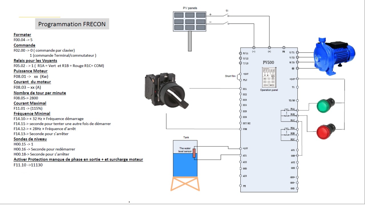 le variateur FRECON pour pompe solaire fonctionne indépendamment du réseau électrique public et ne produit aucune pollution, ni bruit. Les applications typiques sont l'irrigation, l'approvisionnement en eau de la collectivité, la pisciculture et l'agriculture.